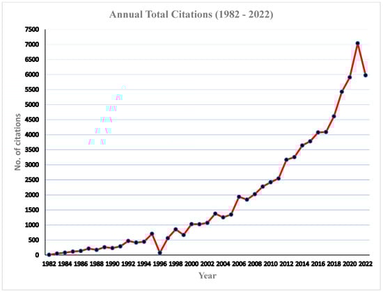 The annual publications of articles on babesiosis during the study period (1982–2022) are presented in Figure 2. There was a steady increase in the number of publications, with mean values of 91.70 ± 43.87, and an annual growth of 2.5% was observed during the study period. The peak period of article production in the research field of babesiosis was recorded in 2021, with 193 (5.1%) articles, while the least number of articles was recorded in 1988, with only 33 (0.87) articles. Even though babesiosis, unlike other diseases, is a neglected tropical disease, few factors have been associated with the steady increase in the number of publications, including the devastating effect of the infection, especially in livestock, leading to severe economic loss by farmers [,]. Secondly, there has been an increase in the number of human babesiosis infections, especially in the USA, Europe, and Asia, with few cases, although not clinical, recorded in Africa and South America [,]. This has led the WHO to classify this infection as an emerging zoonosis []. Several scholars have attributed the underreporting of human babesiosis in Africa to its similarity to the clinical manifestation of infection with malaria, especially where malaria is endemic, there is poor disease surveillance, and limited funding is allocated for research. The total annual citations is presented in Figure 3. A steady increase in the number of total citation was clearly observed, with an average of 1874.8 citations per year; however, the maximum number of citation was recorded in the year 2021, with a total of 7039 citations. Similarly, the highest number of publication was in the same year.