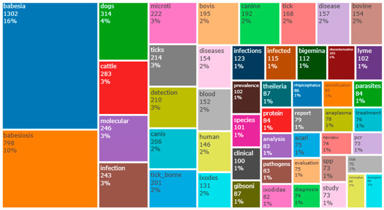This analysis was performed using a tree map of the most frequently used words in the title of research on Babesia infection, and the results are shown in Figure 4. Babesia was the word with the highest frequency of 1302 (16%). Babesiosis, dogs, and cattle were among the top four most frequently used words in the title of research on the study area, with frequencies of 798 (10%), 314 (4%), and 283 (3%), respectively.