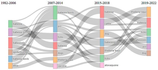 Bibliometrics refers to the quantitative evaluation of the occurrence of certain events in the scientific literature, as opposed to the analysis and interpretation of the content of the literature. In the context of this study, bibliometrics was employed to condense the most illuminating outcomes of a collection of bibliographic papers. This analysis provides information associated with evolutionary trends and changes across different subperiods [,]. To identify evolutionary changes, a thematic analysis for Babesia infection was carried out for the period 1982–2022. A Sankey diagram was used to visualise and understand the analysis. This diagram comprises a node that represents a particular subject, and its size is determined by the frequency of the keyword. A line shows the connection between two different nodes. The width is determined by several keywords. The study period (1982–2022) was divided into five categories: 1982–2006, 2007–2014, 2015–2018, and 2019–2022, as shown in Figure 5.
