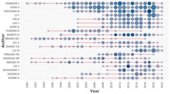 Similarly, authors’ productivity over time considering the literature on babesiosis is graphically presented in Figure 6. In the year 2012, Igarashi I. had the highest number of publications (11) and mean citations per item (17.82). Another top-rated researcher in this field is Xuan X., with prominent figures regarding the number of publications (139), h-index (23), and g-index (32). In 2021, Xuan X. had the highest number of publications (16) and (19) citations, as graphically represented in Figure 5. Most of his research outputs were published in high-ranking journals in terms of impact factor. A notable example is his contribution to the genetic (transplacental) transmission of Babesia gibsoni infections in dogs, published in the International Journal for Parasitology, with 138 citations, which provided insight into vertical transmission []. The study was able to establish generational transmission via the uterus and not trans-mammary as it was earlier speculated. This was the first confirmatory report on the transplacental transmission of Babesia species within a definitive host. A study published in Veterinary Parasitology, which centred on the use of both serology and molecular procedures to detect Babesia infection in water buffaloes from Thailand, has 125 citations so far []. The results of the study showed variation in the prevalence of the infection owing to the sensitivity and specificity of each diagnostic approach used, which was statistically significant. The overall prevalence of B. bovis and B. bigemina was, respectively, 16.8% and 5.6% using the indirect fluorescent antibody technique (IFAT), 11.2% and 3.6% using nested polymerase chain reaction (nPCR), and 14.7% and 5.9% using the enzyme-linked immunosorbent assay (ELISA). Xuan X. has been contributing to the literature on Babesia infections since 1999.