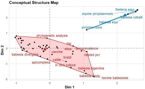 Conceptual frames associated with babesiosis studies (1982−2022). The 3763 articles used for the study showed K-means clustering with two clusters with 41 and 4 elements, highlighting the conceptual frameworks linked to babesiosis. Note: The elements closest to the centre are the essential elements.