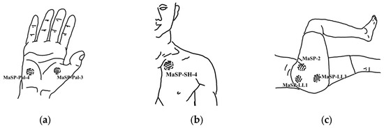 Three of the twenty pressing steps are major signal points (MaSP): (a) MaSP of wrist/palmar at signal 3 and 4; (b) MaSP of shoulder at signal 4; (c) MaSP of lateral side of leg at signal 1, 2, and 3.