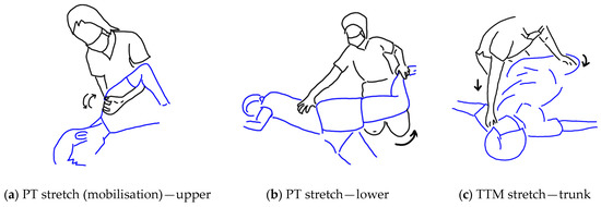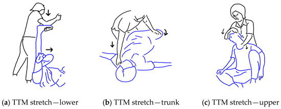 In TTM, typically at the very end of the protocol, the therapist may take the client through a routine comprising a number of passive stretches (i.e., the therapist initiates the movement, and the patient watches and allows the movement to occur) [14,15]. The client will generally sit up and, according to the flexibility of the client, the therapist will pick say 5 to 10 out of a set of approximately 40 well-established stretching manoeuvres. With the client remaining passive, the therapist will gently flex, extend, adduct, or abduct the arms and flex, extend, and rotate the whole torso and/or head and neck in the manner that is prescribed and within a safe range of movement that approaches the end point for the particular movement in the individual patient. Since the muscles have already been “warmed up” and the pain eased, there is an opportunity for the passive stretching “exercises” to improve the flexibility of the client [16].