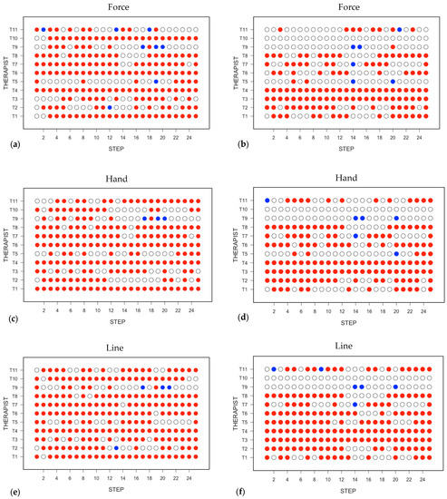 The responses from the 11 TTM therapists with regard to whether they felt satisfied that they understood the procedures to follow in each step in the TTM protocol and confident to administer the massage at each step. In each panel, the satisfaction scores are plotted on the left and the confidence scores on the right: (a,b) what force to apply; (c,d) what position to place the hands; (e,f) following the Sen Seb line. A red symbol denotes satisfied or confident, a blue symbol denotes not satisfied or not confident, and an open circle denotes that the therapist is undecided.