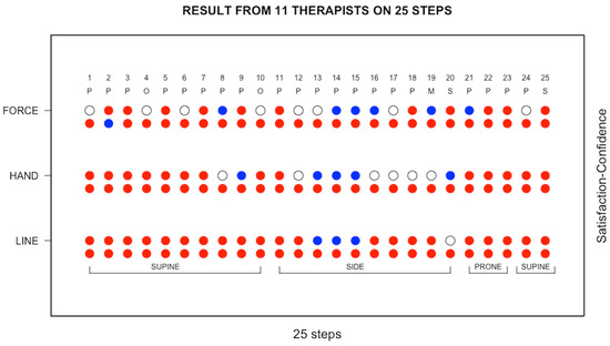 The scores of the 11 TTM therapists with respect to whether they felt satisfied in having learnt and confident to follow the Sen Seb lines (i.e., line), adopt an appropriate hand position (i.e., hand), and apply an appropriate force (i.e., force) at each step are displayed in Figure 3. In each panel of Figure 3, the satisfaction scores are plotted on the left and the confidence scores on the right; a red symbol denotes satisfied or confident, a blue symbol denotes not satisfied or not confident, and an open circle denotes that the therapist is undecided. In Figure 4, the data presented in Figure 3 have been averaged across all 11 TTM therapists. The confidence and satisfaction scores that were recorded for the individual TTM therapists and plotted in Figure 3 were averaged across all 11 therapists, and the results are shown in Figure 4, where the average confidence scores are plotted above the average satisfaction scores. For each of line, hand, and force, the symbol is coloured red when the majority of the therapists gave a positive score, an open circle when an equal number of therapists gave positive and negative scores, and coloured blue when the majority of the therapists gave a negative score. The large number of red symbols in both Figure 4 and Figure 5 indicates that the TTM therapists were generally satisfied that they knew what to do and were confident of being able to carry out the steps of the massage protocol correctly. The main concerns were related to the first two stretches, which are of the upper body (step 19) and lower body (step 20) and performed with the patient in the side lying position. There was also some concern regarding the hand position to adopt in pressing of the lateral leg and thigh (Step 13), as well as the amount of force to apply in the pressing of the anterior leg in the supine lying (Step 2), pressing of the gluteus MaSP also in the side lying (Step 14), and pressing of the posterior leg in the prone (Step 21) positions.