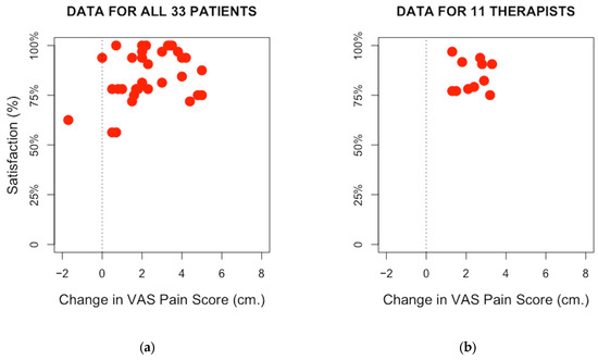 Satisfaction expressed by each patient in respect to the massage they received plotted against the difference between the pre- and post-treatment pain intensity scores, represented by the red spot: The vertical dotted line indicates the differentiation between pain improvement and worsening; (a) all individual office workers; (b) average of three OS patients treated by each therapist.