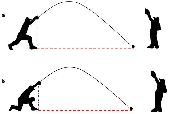 Pitching linear length assessment procedure. Investigated athletic gesture performed by visually impaired pitcher (left black silhouette) both in orthostatic (a) and kneeling (b) position, placing the dominant upper limb overhead and following the auditory target provided by the sighted catcher (right black silhouette). The ball has a parabolic trajectory (black curve line) from hand release point to the first landing mark. The horizontal distance between ball release point orthogonal projection on front foot and the landing mark can be equated with pitching linear length (red dotted line) and assessed using a track and field measuring tape.