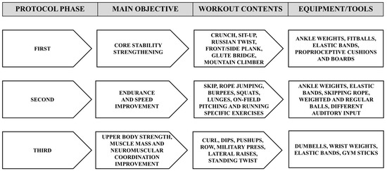 The tailored workout protocol aimed to follow competitive season pace without causing any psychophysical overload, and was conceived as an 8-week intervention, from May to July 2022, performed on field as a single 90 min session every week. Considering the needs and safety of visually impaired athletes and the team heterogeneity, a circuit training methodological approach was applied. This methodology was chosen in order to respect the individual fitness and residual skill level and simultaneously facilitate exercise explanation/demonstration, as well as autonomous subject spatio-temporal orientation. Since reactive agility, running speed, and pitching power and precision—training protocol main objectives—are multifactorial parameters, both general and specific exercises were performed to strengthen the anatomo-functional prerequisites, global/segmental coordination, and sport specific-gesture kinetic chain activation and control. Finally, given the progressive load increase typical of the championship season that is regularly played during a particularly hot period such as the Italian summer, the intervention was organized in three phases characterized by a gradually enhanced psychophysical effort. In detail, since the trunk plays a key role in motor control, balance, and force delivery from the lower to upper limbs, the first phase focused on core stability improvement. The second phase aimed to enhance physical endurance and running speed through simulated competitive game frames. Lastly, the third phase was centered on increasing upper body strength, muscle mass, and neuromuscular coordination, with the aim of boosting technical gestures power while reducing shoulder and elbow injury risk. Each workout session was designed and led by recalling the pre-game and in-game situations, thus fastening the adaptability, and concurrently promoting the competitive mindset and protocol adherence of the athletes. The specific objectives, contents, and equipment of each phase of the AAT protocol are detailed in Figure 2. As examples, two detailed workout schedules focusing on the running and pitching training are available as Supplementary Materials.