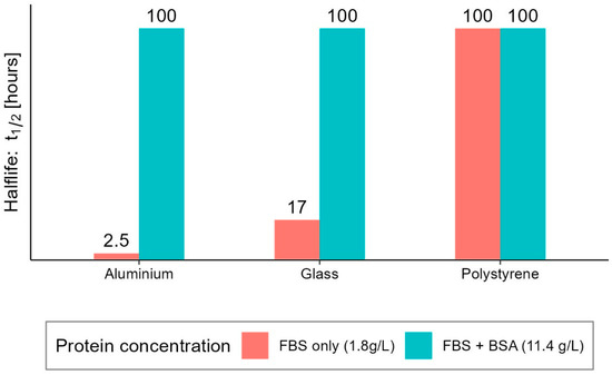 Figure 1. Effect of protein concentration of culture medium on SARS-CoV-2 survival on aluminium, glass and polystyrene surfaces under the same environmental conditions. Visualisation generated from the data published by Pastorino et al. [29]. The authors reported half-lives greater than 96 h as maximum values, here conventionally reported as 100 h for visualisation purposes. FBS: foetal bovine serum; BSA: bovine serum albumin; final protein concentration in parentheses.