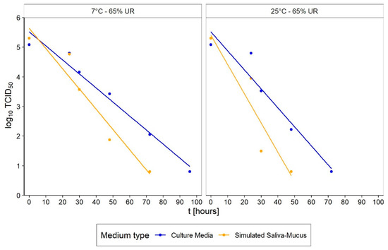 Figure 2. Effect of medium on SARS-CoV-2 survival on stainless steel surface under different environmental conditions. Elaboration generated from the data published by Szpiro et al. [30].