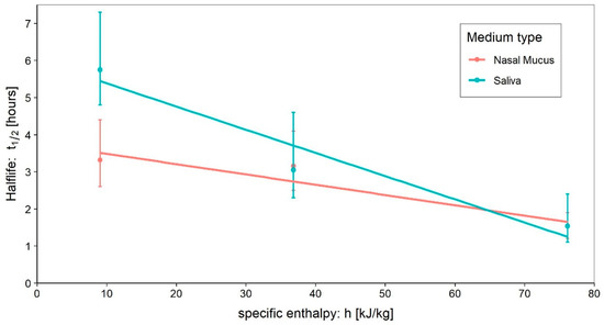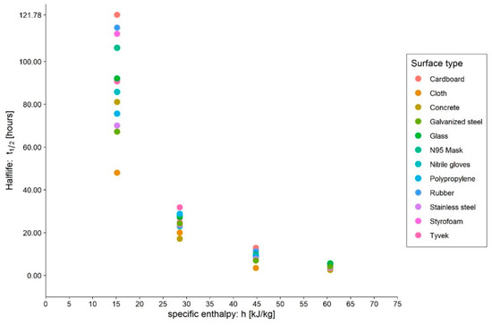Figure 3. Effect of medium on SARS-CoV-2 survival on polystyrene surfaces under different environmental conditions. The analysis was carried out using the data published by Matson et al. [31]. The data are plotted with a small amount of jitter due to the presence of the same values of half-lives at intermediate enthalpy values (around 35–40 kJ/kgdry-air). - Pollutants: the opinion of the scientific literature is now converging on the established role of pollutants in the survival and transmission capacity of viruses [32,33]. However, this role is especially significant when studying the survival of viruses in aerosols; it does not appear to be relevant—as was also the case in the present study—for the survival of SARS-CoV-2 on surfaces.
