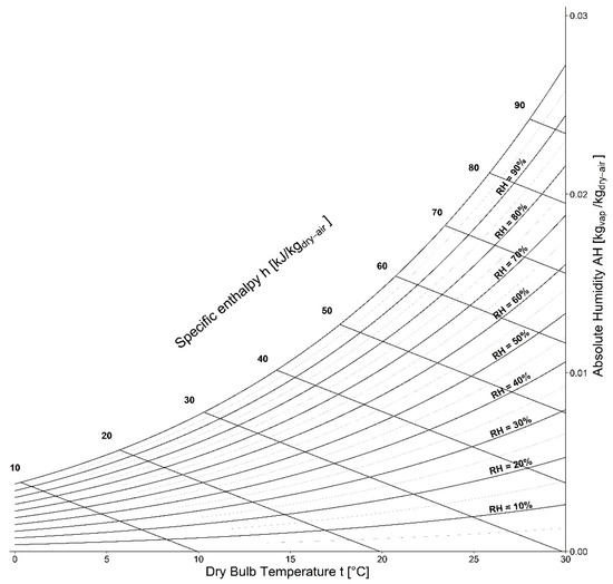 in which C1 = −5.8002206 × 103, C2 = 1.3914493 × 100, C3 = −4.8640239 × 10−2, C4 = 4.1764768 × 10−5, C5 = −14452093 × 10−8, C6 = 6.5459673 × 100, whereas T is the absolute temperature in Kelvin degrees, namely T = t + 273.15. In Figure 4, a map (in terms of psychrometric chart) of the most significant environmental conditions occurring at the ground in terms of indoor or outdoor thermodynamic states of equilibrium is reported.