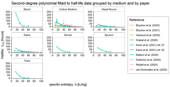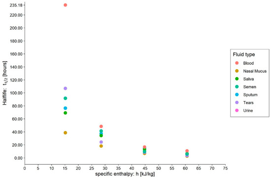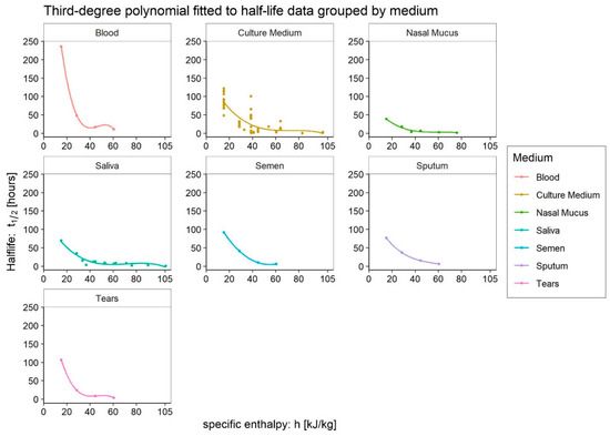 - Medium: different media, or the variation in their composition, is another confounding factor [26,27,28]. The protein composition of the medium, for example, alters the ability of the virus to proliferate and survive, as demonstrated by Pastorino et al. [29] (Figure 1). This constitutes a further obstacle when comparing data from different experiments. We can perceive this dependence appropriately by visualising the data from the work of Szpiro et al. [30] (Figure 2) and Matson et al. [31] (Figure 3), the latter expressly given as a function of specific enthalpy.