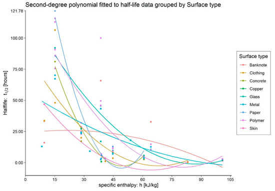 Taking note of the above evidence on the influence of the media used to carry out surface virus survival tests, the seasonal behaviour of SARS-CoV-2 also appears rather pronounced (Figure 5). This happens not only from a qualitative point of view but also from a quantitative one. As we can observe from the reprocessing of the data published by Kwon et al. [27,42] in Figure 8 and Figure 9, the dispersion of the measuring points does indeed increase as the specific enthalpy decreases. The dependence of the survival on the surface and fluid in which inoculation takes place is most pronounced at low enthalpies, that is, the region of best virus survival (Figure 8). In that range of specific enthalpies, the effects of different surfaces and media on SARS-CoV-2 survival should be investigated the most.