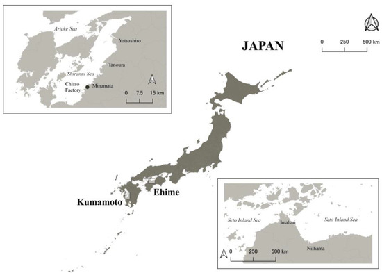 A map of the study areas. The upper left rectangle shows Minamata City and surrounding areas, and the lower right rectangle shows Niihama City and surrounding areas.