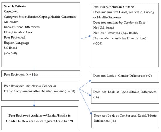 | Martin, C.D. (2000) [46] | Quantitative | 1990 Informal Caregivers Survey (ICS) | Estimated the effects of race and gender on the relationship between a caregiver’s situation and feelings of burden. | N = 811, 26% male. Female: White (505, 62.2%), Black (76, 9.5%). Male: White (207, 25.5%), Black (23, 2.8%) | African American men are more likely to report feeling burdened compared to other race–sex groups (p. 1000) | |
