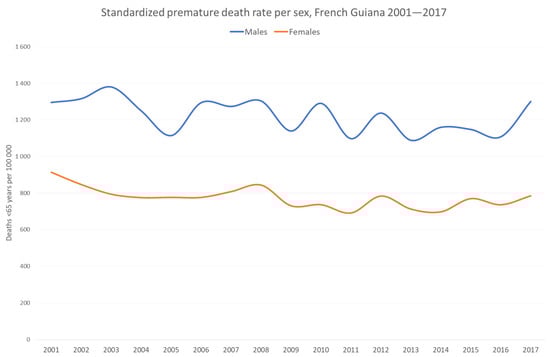 Figure 1 shows the standardized premature death rate per sex in French Guiana. Between 2001 and 2016, there was a gradual decline. In 2017, a prolonged blockade of the city and a 74-day hospital strike hampered access to care, which may have explained the surge in the premature death rate. The jagged lines correspond to the exacerbation of fluctuations due to the small population size of French Guiana.