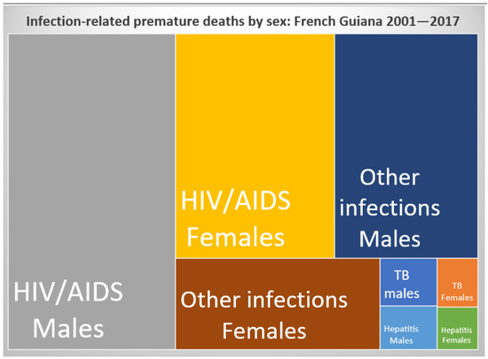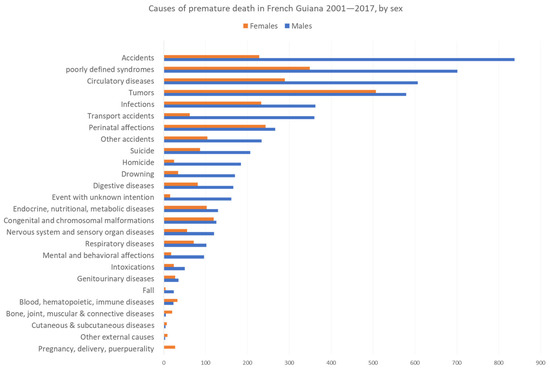 Cause of premature death in French Guiana 2001–2017, by sex. Males are represented in blue and females in orange.