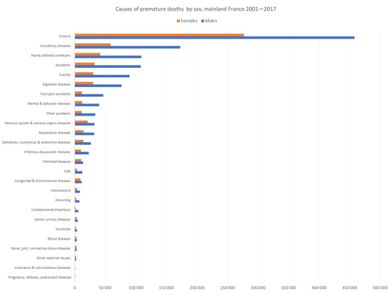 Causes of premature deaths by sex, mainland France 2001–2017. Males are represented in blue and females in orange.