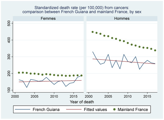 Standardized death rate from cancers: comparison between French Guiana and mainland France, by sex. Green dots represent mainland France, the blue line represents French Guiana and the red line is the fitted line for French Guiana.