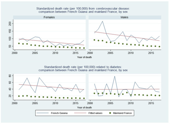 For circulatory diseases, the death rate declined both in French Guiana and France. The top two plots in Figure 6 show that, although in regular decline, cerebrovascular diseases were more frequent in French Guiana than in France, especially in males. The two bottom graphs of Figure 6 show that the excess of mortality linked to diabetes was substantially greater among females than among males. However, mortality from diabetes apparently tended to decline in females but not in males.