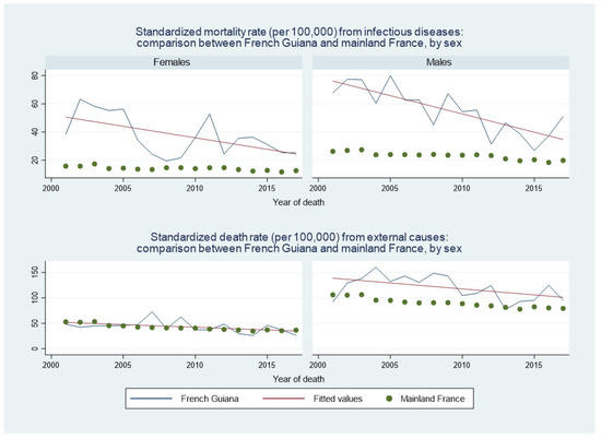 Standardized death rate from infectious disease: comparison between French Guiana and mainland France, by sex. Green dots represent mainland France, the blue line represents French Guiana and the red line is the fitted line for French Guiana.
