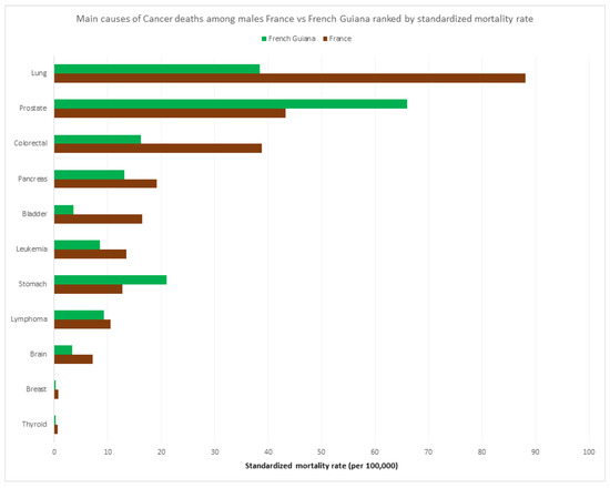 Figure 8 and Figure 9 show the respective ranking of the standardized death rate by cancer for males and females. Apart from the overall excess cancer deaths in males versus females (Figure 5), and in mainland France versus French Guiana, the most striking specificities in French Guiana for males were the excess burden of prostate cancer and stomach cancer relative to mainland France, and for women, the excess burden of uterus cancer (cervix and other parts) and stomach cancer. Among women, two of the main cancers were related to an infectious agent (HPV, and H. pylori).