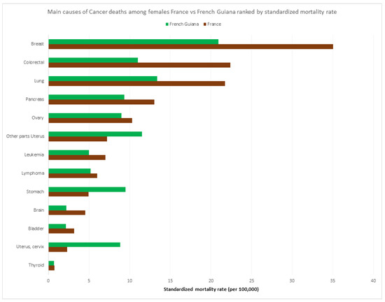 Main causes of cancers among females France vs. French Guiana ranked by standardized mortality rate.