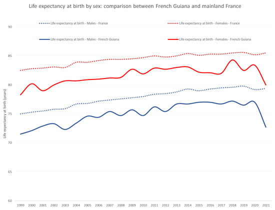 Most of the population lives in three cities on a coastal strip Cayenne, Kourou, and Saint Laurent du Maroni, but 20% live in the interior of French Guiana with no road access and, mostly, no specialized care but a network of primary care centers scattered in the remote villages. As with many countries, French Guiana transitioned from a high burden of infectious diseases and child mortality towards a greater burden of non-communicable diseases. French Guiana has the highest gross domestic product (GDP) per capita in Latin America and, by far, the greatest health expenditure per capita [8]. The health and the social security system are the universal French system where health is a basic right inscribed in the law of the land. Hence, the poorest benefit from the “Protection Universelle MAladie”, which covers them for public and private care; undocumented immigrants residing in French Guiana also benefit from the “Aide Medicale Etat”, which gives them similar benefits as the Protection Universelle MAladie. This is important because in French Guiana, 29% of the population, and nearly half of the adults, are immigrants, usually attracted by the territory’s economic prospects. Thus, French Guiana’s highest GDP per capita in Latin America tends to overshadow the fact that over half of its population lives under the poverty threshold [9]. Over 36% of families consist of single mothers, and 57% of unemployed persons are women. This results in complex social inequalities of health regarding infectious, nutritional, obstetrical, and non-communicable diseases. These inequalities often correspond to delays in diagnosis and access to care, and often lead to renouncing care altogether [10,11,12]. However, for prolonged diseases, such as diabetes or HIV, once persons are in care, the universal health system in French Guiana actually levels prognoses and erases the differences that are observed before patients are taken care of by the system [13]. We hypothesized that, in the complex context of French Guiana, different vulnerabilities and different risk factors between genders [14] may lead to complex differences in health outcomes, mortality, and life expectancy. Our aim was, thus, to compare male and female mortality and life expectancy, to compare it between French Guiana and mainland France, and to look at temporal trends and the main specific causes of death in order to identify actionable singularities.