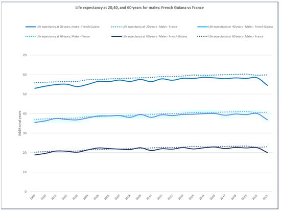 Excluding 2021 (massively impacted by COVID-19), when looking at life expectancy at ages 20, 40, and 60 years (Figure 11), it appeared that in males, at 40 and 60 years, life expectancy was slightly lower (p = 0.02) at 40 or on par at 60 years (p = 0.11) with that in mainland France. However, at 20 years, it was clearly lower than in mainland France.