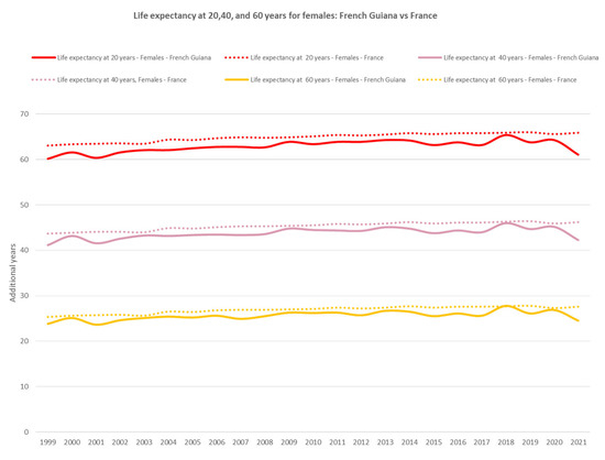 Life expectancy at 20, 40, and 60 years for females: French Guiana vs. France. The dotted lines represent mainland France and the solid lines represent French Guiana.