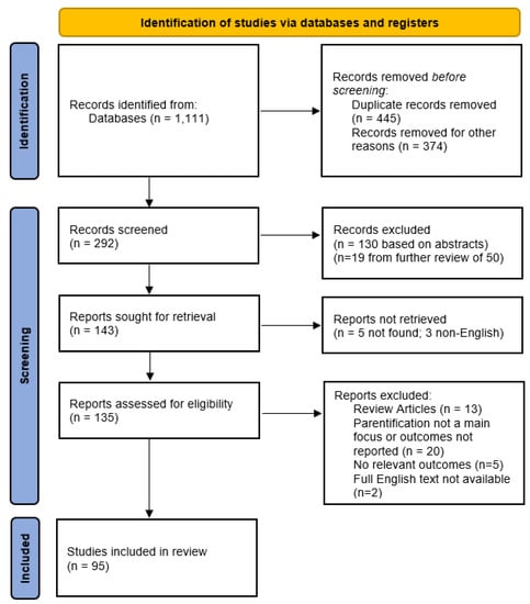 A total of 1111 articles were retrieved across three databases (227 from PsycInfo; 313 from Academic Search Complete; 571 from Web of Science). Of these, 445 were duplicates and 374 were removed for other reasons (e.g., review articles, no outcomes included, no mention of parentification or related terms or constructs). The manual screening was performed on 292 abstracts and 149 were excluded for not meeting inclusion or meeting exclusion criteria. Of the remaining 143 articles, 135 could be retrieved for eligibility assessment, 40 of which were excluded. The 40 articles were excluded for not meeting the inclusion criteria of our review; specifically, these articles were review articles (n = 13), did not include exposure (i.e., at least some participants reporting parentification experiences) or outcome variables (n = 21), reported irrelevant outcomes (n = 4), or summaries in English but the English full-text article could not be located (n = 2). This review focuses on 95 articles successfully screened and meeting all eligibility criteria. The PRISMA flow diagram outlining inclusion and exclusion processes is presented in Figure 1.