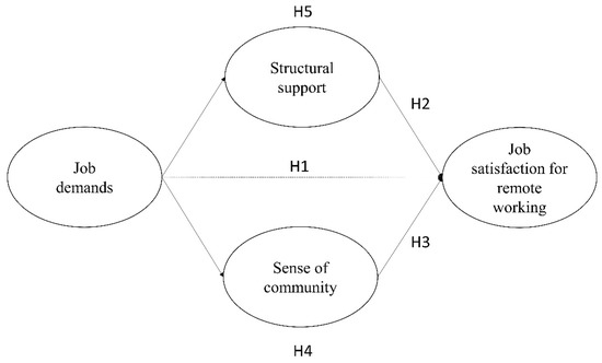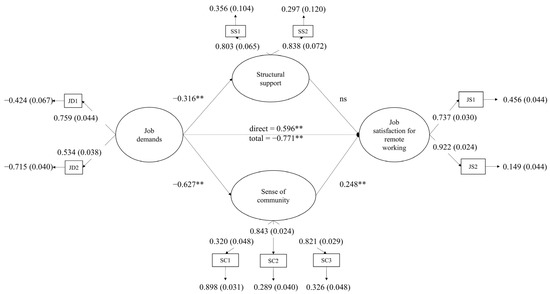 All the mentioned hypotheses were confirmed, except H2 (structural support is associated with job satisfaction for remote working) and H5 (structural support mediates the relationship between job demands and job satisfaction for remote working). Job satisfaction for remote working was significantly associated with job demands (H1; βdirect = −0.596, p < 0.01; βtotal = −0.771, p < 0.01) and sense of community (H3; β = 0.248, p < 0.01).
