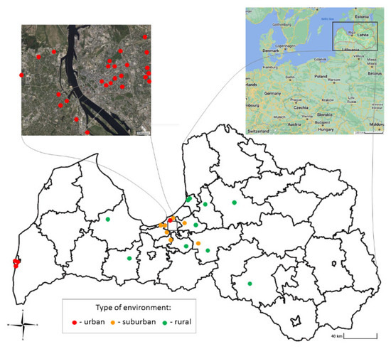 Site map of Latvia and Riga with the different types of environments represented by colored dots: red dots—urban, orange dots—suburban, and green dots—rural sampling sites [27].