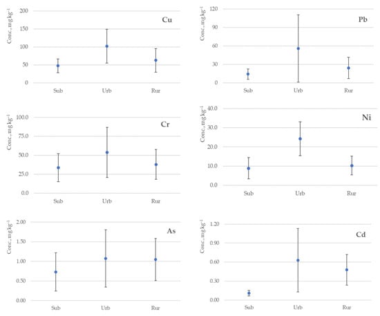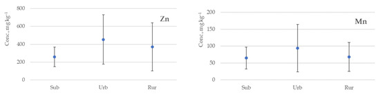 Arithmetic mean concentrations (mg kg−1) with the relevant standard deviations of selected metallic elements in different sampling locations: urban (Urb) (n = 50), suburban (Sub) (n = 23) and rural (Rur) (n = 31).