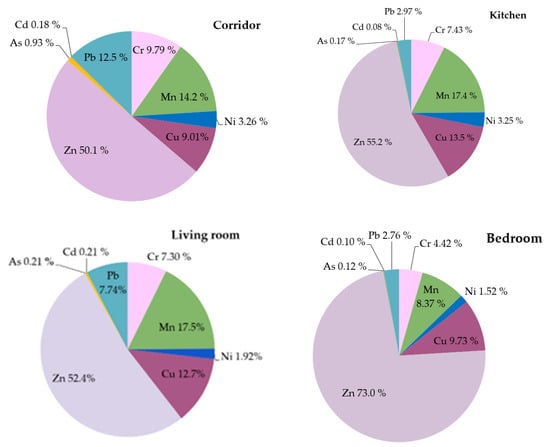 Percentages of selected metallic elements in indoor dust gathered from different rooms within dwellings (corridor n = 6 samples; kitchen n = 10 samples; living room n = 33 samples; bedroom n = 45 samples).