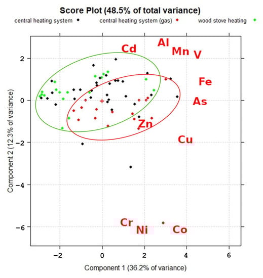 In this study, experimental data from 120 samples were analyzed for 25 elements (Li, B, Na, Mg, Al, K, Ca, V, Cr, Mn, Fe, Co, Ni, Cu, Zn, As, Se, Rb, Sr, Cd, Ba, La, Ce, Pb and Bi) across three sampling locations with central heating systems, central heating systems with a gas stove and wood stove heating, using PCA (CAT software, manufacturer, city and country). PCA can help to decrease the dimensionality of a dataset while retaining critical information by detecting and retaining the principal components that capture the most variation in the data [55]. Concentration of chemical elements is the loading parameter for this PCA, which shows the influence extent of each element of the PCA score plot (samples). The further away from the center the element is, the more it affects the resulting score. Current results of PCA showed that the overall deviances between the samples can be characterized by component 1 (36.2%) and component 2 (12.3%). The obtained PCA plot, shown in Figure 4, shows that most differences between the groups can be observed in component 2, where all studied elements are separated into three groups: Cd, Al, Mn, V and Fe in the first group; Zn, As and Cu in the second; and Cr, Ni and Co in the third group, which had a negative correlation with the first group. In addition, PCA showed that samples from dwellings with central heating systems operated with gas tended to differ from the samples from dwellings with wood stove heating. The main differences between these two groups were in the concentrations of Zn, Cu, Cr, Ni and Co, which were lower in the dwellings with wood stove heating, where the concentrations of Al, Mn, Fe and As were higher, as explained by the higher amount of these elements in wood.