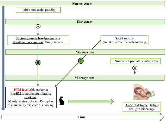 We considered the dyad’s sociodemographic variables and exposure biomarkers in the microsystem. Arrows B, C and D represent how variables from other contexts influence pregnant women and the outcome in the microsystem.
