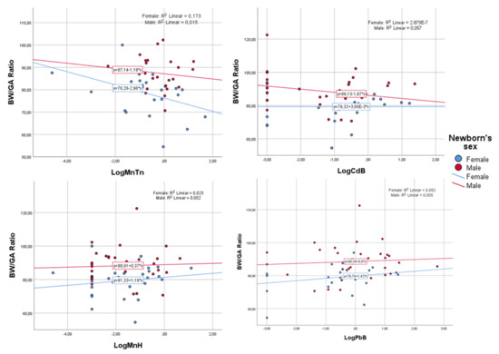 Regarding biomarkers, bivariate analysis demonstrated no association with birth weight or BW/GA ratio in either Student’s t-test (Table 3) or Spearman’s coefficient correlation (Table 4). However, considering only females, MnTn showed a significant weak negative correlation (rho= −0.478; n = 24; p = 0.018) with the BW/GA ratio. This influence of sex can be seen in Figure 2, which shows the BW/GA ratio dispersion graphs as a function of the log of biomarkers according to sex. Although not statistically significant, LogCdB also showed a weak negative correlation (rho= −0.157; n = 31; p = 0.400) with the BW/GA ratio, but only for boys.