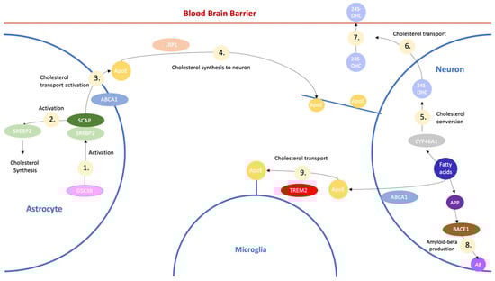 As previously mentioned in Section 1, the synthesis of cholesterol mainly takes place in the astrocytes and is further transported between the neurons and microglia. An overview of cholesterol transport in the brain is provided in Figure 1, below.
