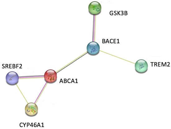 A number of drugs have been developed in order to inhibit target genes that play critical roles in Alzheimer’s disease pathology. Two potential target genes, GSK3B and BACE1, have been deemed possible candidates as disease-modifying agents for Alzheimer’s disease due to their involvement in amyloid-beta and tau production, as well as their ability to enhance cognitive functions []. In addition to these two genes, the proteins SREBP2, TREM2, LRP1, and the CYP46A1 gene are all additional candidates as targets to combat Alzheimer’s disease due to their involvement in the metabolic pathway of cholesterol in the brain [,,,].