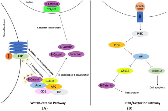 GSK3B protein is a growth-signaling kinase regulated by inhibitory phosphorylation downstream of the Wnt pathway []. Studies have attributed this protein to having a role in memory and has been connected to Alzheimer’s disease due to the fact that its activation can lead to tau phosphorylation and amyloid-beta plaques. Two main pathways of GSK3B activation exist, including the Wnt/B-catenin pathway and the PI3K/Akt/mTor pathway (as shown in Figure 3). Through the Akt pathway, the GSK3B protein inhibits the expression of CREB, which is a binding protein that aids in cell survival and other vital functions []. GSK3B has also been found to phosphorylate various components of this pathway including Akt, RICTOR, TSC1 and 2, PTEN1 and 2, and others []. The Akt pathway is initiated by the activation of PI3K by cell surface receptors including RTK, GPCR, and cytokine receptors. Next, PIP3-binding proteins stimulate the synthesis of PIP3 and activate downstream signaling to promote cell growth, proliferation, and metabolism. Akt then phosphorylates and inhibits GSK3B, hindering its kinase activity and promoting cell survival. However, GSK3B directly phosphorylates several components including Akt. On the other hand, GSK3B simultaneously phosphorylates and destroys B-catenin throughout the Wnt pathway []. B-catenin plays a large role in regulating cell differentiation, proliferation, and apoptosis, and therefore has been found to enhance cognitive and memory abilities []. Although this pathway is not completely understood, it is known that GSK3B is associated with Axin and other molecules to create a complex that allows GSK3B to phosphorylate Axin, APC, and B-catenin. GSK3B then phosphorylates B-catenin on Thr41, Ser37, and Ser33, which allows B-TrCP to recognize B-catenin and consequently become degraded []. It has also been found that GSK3B can form a complex with B-catenin, therefore lowering the levels of B-catenin/TCF transcription and inhibiting Wnt signaling. Wnt signaling plays an important role in synaptic plasticity and maintenance in the adult brain. The compromised synaptic signaling is associated with Alzheimer’s disease [].