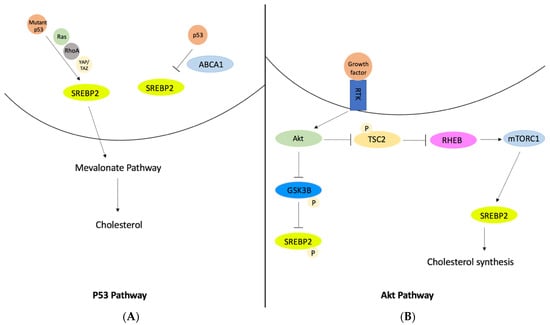 Major signaling pathways that regulate SREBP2 activation during cholesterol synthesis: (A) P53 pathway, and (B) Akt pathway. In the p53 pathway, mutant p53 binds to SREBP2 and subsequently activates the Ras, RhoA, YAP/TAZ pathways, while p53 blocks the activation of SREBP2 through ABCA1. Once SREBP2 is activated, it signals the mevalonate pathway to synthesize acetyl-CoA into cholesterol. In the Akt pathway, growth factors bind to receptor tyrosine kinases to activate PI3K, which then activates Akt. Akt phosphorylates and inhibits TSC2, which inhibits RHEB and activates mTORC1. MTORC1 works with other targets to stimulate and activate SREBP2. However, the activation of Akt may directly phosphorylate GSK3B, which will mediate phosphorylation and inhibition of transcription factors including SREBP2. This promotes proteasomal degradation.
