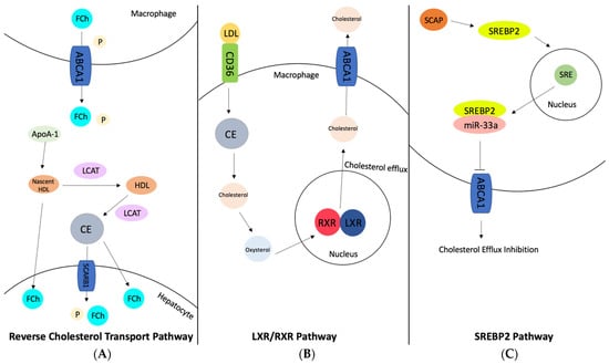 Major pathways in which ABCA1 plays an important role for cholesterol transport in brains: (A) Reverse cholesterol transport pathway, (B) LXR/RXR pathway, and (C) SREBP2 pathway. In the reverse cholesterol transport pathway, free cholesterol is transported out of the macrophage to ApoA-1. ApoA-1 then becomes pre-B-HDL or nascent HDL. Nascent HDL then becomes mature HDL which is mediated by LCAT. LCAT then mediates cholesterol esterification of HDL into cholesterol ester (CE). The cholesterol esters are then taken up by SCARB1 receptors and taken up into hepatocytes. Cholesterol esters are then hydrolyzed to generate free cholesterol (FCh) in hepatocytes. In the LXR/RXR pathway, ligand LDL binds to receptor CD36, which oxidizes LDL into cholesterol esters. The cholesterol esters are converted into cholesterol, which is then converted into oxysterols. The oxysterols activate LXR/RXR, which then promotes cholesterol efflux from the nucleus, which then activates ABCA1 to transfer cholesterol out of the macrophage to Apo acceptors. In the SREBP2 pathway, SCAP transports SREBP2 from the ER to the Golgi apparatus. SREBP2 is then translocated to the sterol regulatory element in the nucleus. Then miR-33a is co-transcribed with SREBP2, which inhibits ABCA1 activity. By inhibiting ABCA1, cholesterol efflux is hindered, therefore cholesterol accumulates. However, inhibiting miR-33a would activate ABCA1 and promote cholesterol efflux.