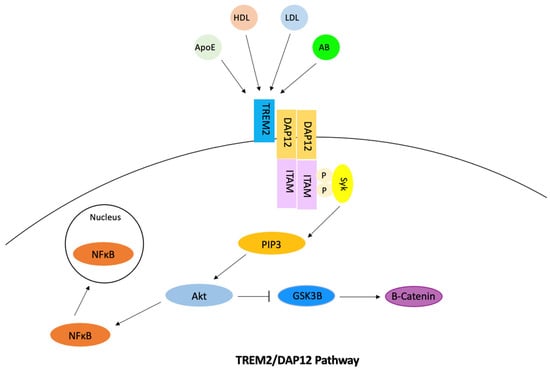 TREM2 is a transmembrane immune receptor that is expressed by microglia in the brain and enhances the rate of phagocytosis. This gene also has anti-inflammatory properties and modulates inflammatory signaling []. In the microglia, signaling of the TREM2/DAP12 pathway was found to promote cholesterol efflux and therefore reduce how much intracellular cholesterol is stored as cholesterol esters (Figure 7). Extracellular ligand binding activates TREM2, which then activates DAP12 []. ITAM then becomes phosphorylated, which causes the Syk kinase to activate downstream signaling molecules including PI3K, ERK, PLCy, and Vav []. The cholesterol is then transported out of the microglia via ApoE-containing lipoproteins. Phosphorylation of DAP12 often affects other pathways and has the ability to inhibit the RAS/MEK/ERK pathway. This inhibition may decrease the secretion of pro-inflammatory cytokines. The phosphorylation of DAP12 also has a direct effect on the uptake of amyloid-beta through its involvement with SHIP1 and the SHIP1/CD2A/RIN3/BIN1 complex. TREM2 also mediates proliferation and survival of myeloid cells by the alteration of the Wnt/B-catenin pathway. Studies found that TREM2 stabilized B-catenin by inhibiting its degradation through the Akt/GSK3B pathway []. TREM2 is also involved in mTOR signaling through the same pathway, which has the ability to alter microglial survival. In relation to Alzheimer’s disease, studies have found TREM2 expression leads to an increase in tau phosphorylation, but this relation has not been studied as much as TREM’s connection to amyloid-beta. TREM2 is thought to have a time-dependent effect on amyloid-beta accumulation. The signaling of TREM2 was found to increase amyloid-beta accumulation in early stages of Alzheimer’s disease and decrease amyloid-beta accumulation in later stages []. Other studies have found TREM2 overexpression to reduce amyloid-beta accumulation []. Through the activation of the NFB pathway, BACE1 expression increases and TREM2 expression decreases due to regulation of miRNA-34a, which causes amyloid-beta accumulation []. Mutations of TREM2 contribute to late-onset Alzheimer’s disease because these variants disturb TREM2 signaling and its functions [].