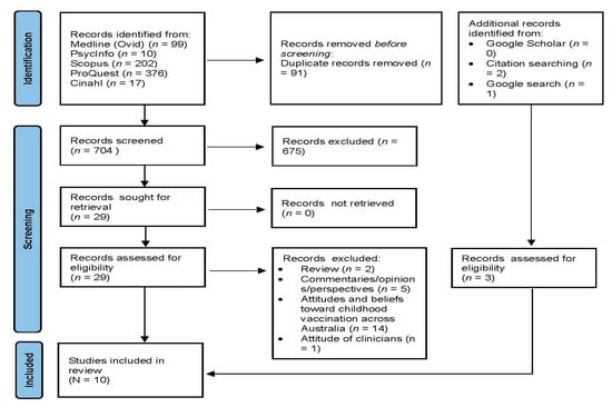 A scoping review was conducted in accordance with the Joanna Briggs Institute (JBI) methodology for scoping reviews [] and reported in accordance with the Preferred Reporting Items for Systematic Review and Meta-Analysis Protocols Extension for Scoping Reviews (PRISMA-ScR) (https://prisma-statement.org/Extensions/ScopingReviews) (accessed on 17 November 2021). This review explored the broad question, ‘What is the impact of the No Jab No Pay and No Jab No Play legislations on childhood immunisation in Australia?’.