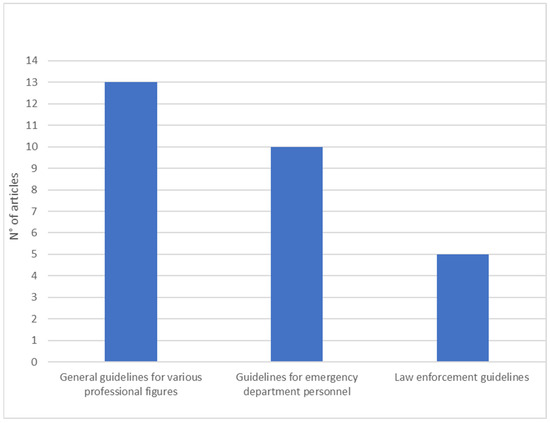 In the first dimension, a total of 28 studies were identified, divided into three sub-categories: thirteen articles provided general guidelines applicable to different professional figures; 10 studies were aimed at emergency department personnel; and five articles elaborated on specific guidelines for law enforcement agencies. The sub-categories identified have several elements in common: all articles reported phases or thematic areas to be studied in succession during the notification of death (contact with survivors, arrival of survivors, notification of death, response to pain, etc.) (n = 28); articles on selection of the staff and/or choice of a professional figure to assist the notifier (n = 9); articles about providing survivors with post-notification care and monitoring their condition through follow-up actions (n = 19); and, finally, articles protecting the privacy of survivors (n = 14). In this and subsequent dimensions, the total number of studies exceeds the total number of selected studies due to the overlapping of several subject areas among different studies.