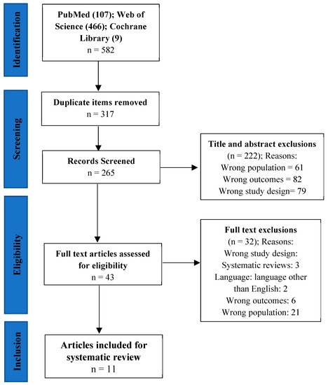 After identifying the meta-analyses (582 items), we proceeded to the selection. The selection involved screening titles and abstracts to remove duplicates (317 items) and irrelevant (222 items) meta-analyses. Irrelevant meta-analyses were either systematic reviews or narrative reviews or meta-analyses that focused on wrong outcomes or wrong populations. The studies that were not duplicates or eliminated by screening (n = 43) were reviewed in full text by two authors (N.F.A. and F.B.) to include meta-analyses that met the following criteria: (a) the average age of the participants must be ≥65 years; (b) the meta-analyses must be conducted on studies that included older adults living in CS; (c) the language of the publication must be English; (d) the meta-analyses must investigate the effect of a PA program on at least one of the two variables of interest: (1) physical outcomes (mobility, balance, gait, strength, fall, fear of falling, and activities of daily living) or (2) mental health outcomes (depression and quality of life); (e) meta-analyses should not include studies with community-dwelling participants. Thus, studies were excluded if participants were in community housing and not only in CS. In all, 11 meta-analytic studies met the different criteria. The selection procedure is illustrated in Figure 1. Finally, the quality of the included meta-analyses was assessed by three authors (M.-P.S., N.F.A., and F.B.) using the Higgin’s tool which is based on questions from the AMSTAR tool and Cochrane Handbook for Systematic Reviews of Interventions [27].