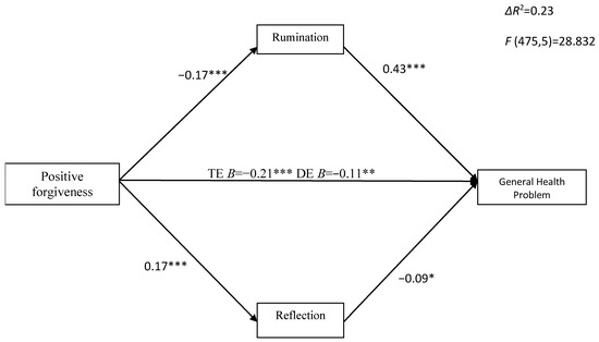 The indirect effect of positive forgiveness on general health problems via rumination and reflection. * p < 0.05; ** p < 0.01; *** p < 0.001; TE—total effect; DE—direct effect.