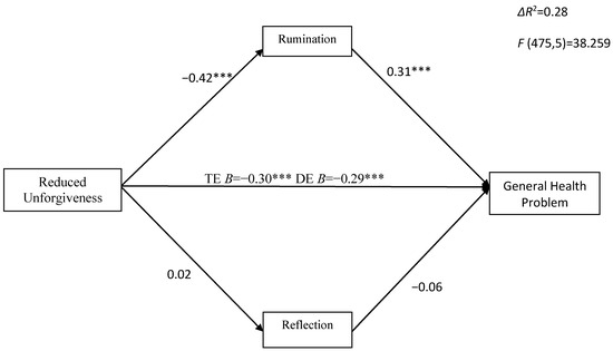 The indirect effect of reduced unforgiveness on general health problems via rumination and reflection. *** p < 0.001; TE—total effect; DE—direct effect.